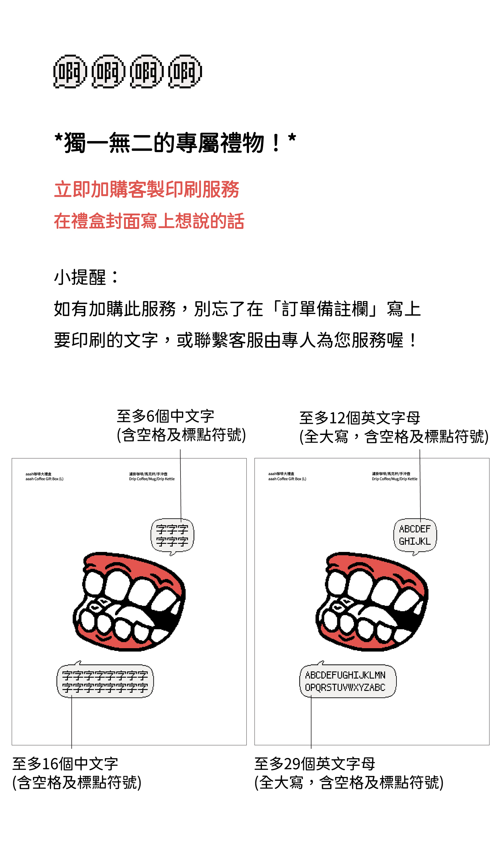 內容物:aaah嘴巴馬克杯*2入、15g咖啡濾掛包*12入(口味任選2種)